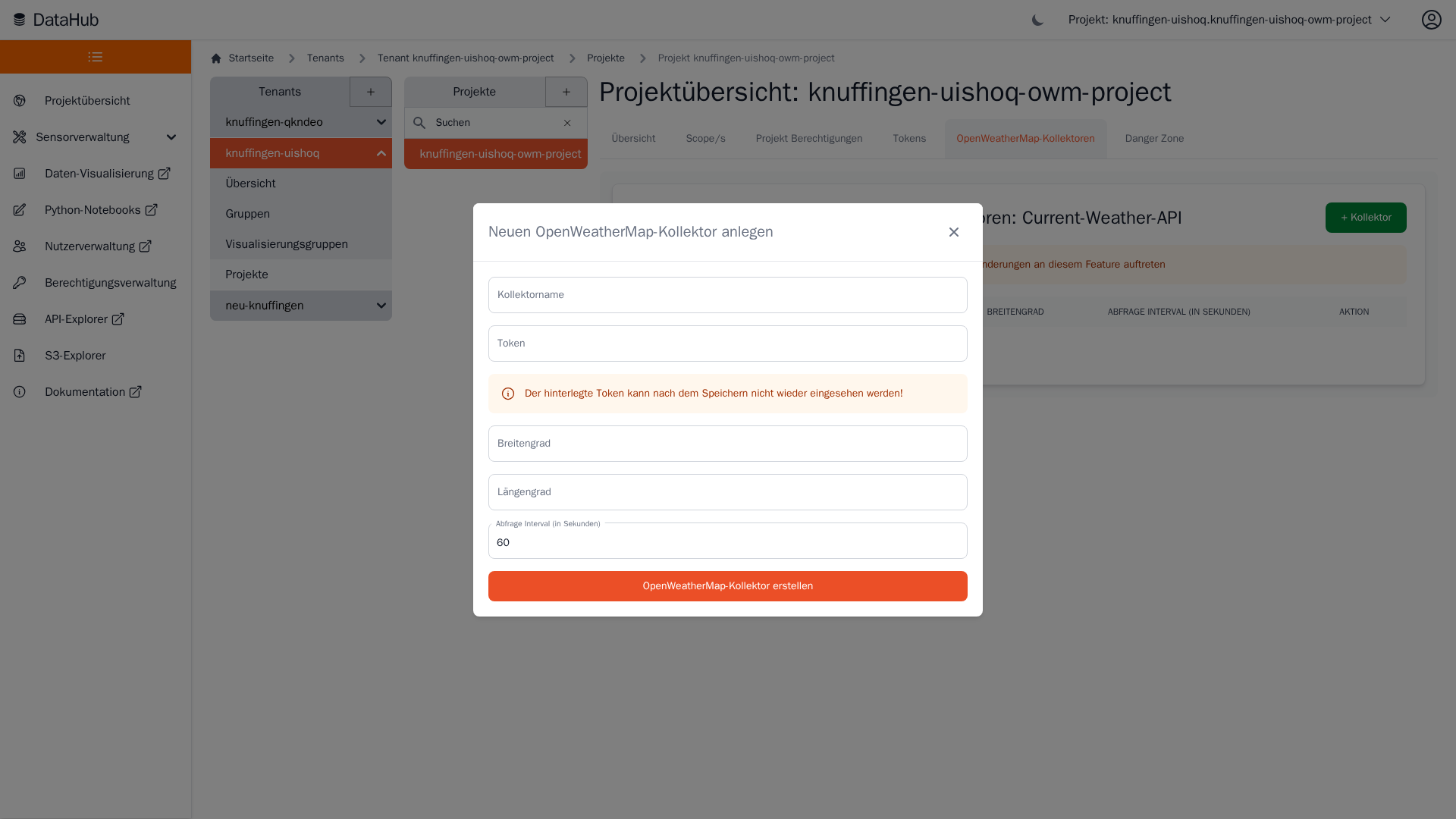 Wetterdaten der Current-Weather-API können mit wenigen Schritten in die Plattform integriert werden. Hierfür können "OWM-Kollektoren" eingerichtet werden, die in selbstkonfigurierbaren Intervallen Wetterdaten von der Current-Weather-API abfragen und an die Plattform senden.