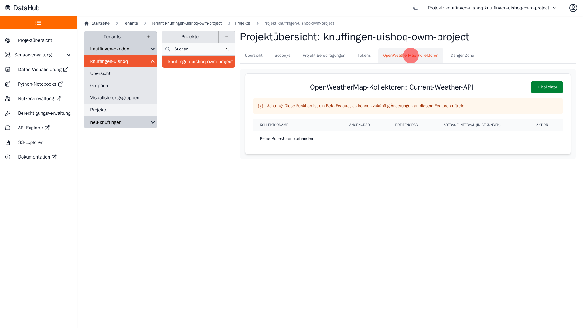 - Im OWM-Kollektor-Menü des jeweiligen Projekts können Sie eine Liste aller bestehenden Kollektoren einsehen.