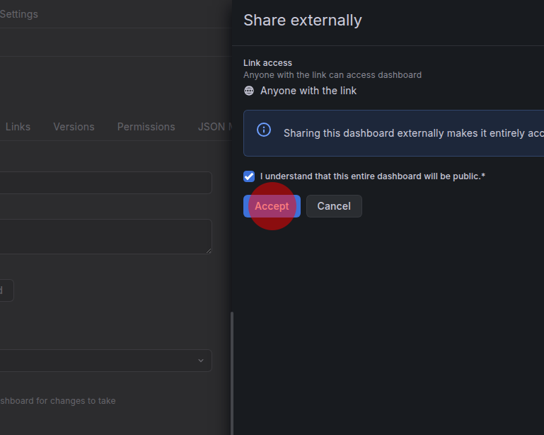 Es öffnet sich eine Seitenleiste, bei der noch einmal bestätigt werden muss, dass das Dashboard für alle Personen mit dem entsprechenden Link einsehbar sein soll: