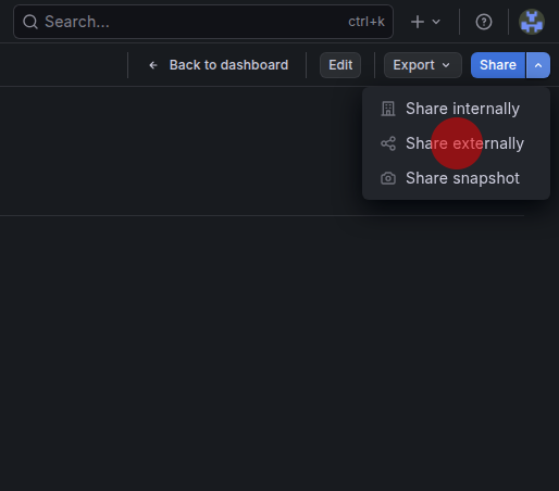 Um ein Dashboard öffentlich teilen zu können, muss aus dem Dropdown neben "Share" "Share Externally" ausgewählt werden: